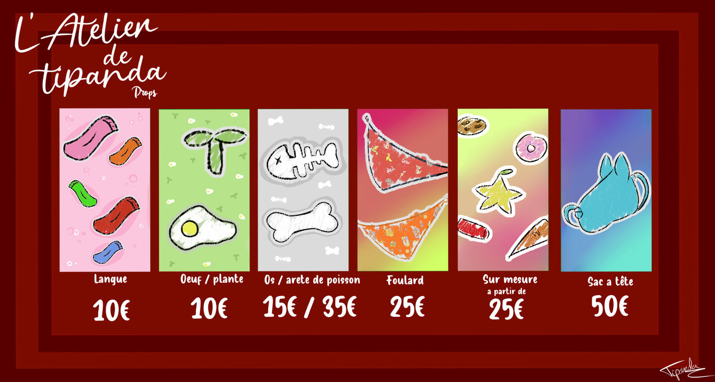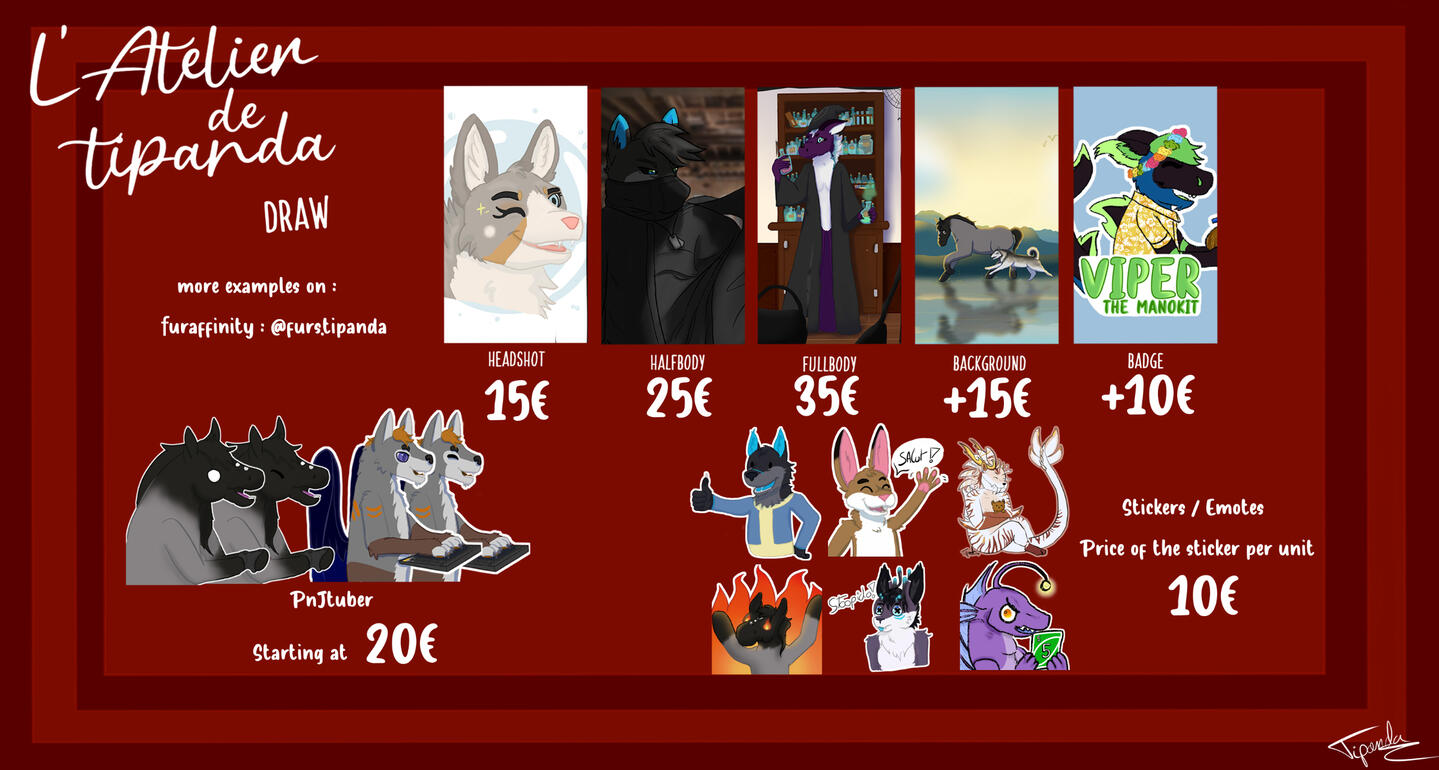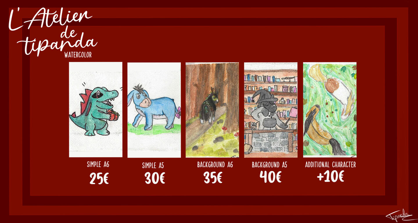| Conditions général |• Les délais d'exécution varie d'une 1 semaine à 4 mois. N'hésitez pas à demander des mises à jour !• Vous n'êtes pas autorisé à utiliser mes œuvres, commandées ou non, pour former l'IA sous quelque forme que ce soit.• Mes œuvres d'art, ou toute pièce qui comprend mon travail, c'est-à-dire des collaborations, ne doivent pas être vendues à des fins lucratives telles que des impressions, des produits dérivés, etc. Ou utilisées dans tout type d'utilisation commerciale en aucune circonstance, sauf discussion préalable.• J'accepte uniquement les paiements sur PayPal / virement bancaire .• Je ne commencerai pas à travailler sur votre commande si le paiement intégral n'a pas été effectué.| Dessin |• Les remboursements sont possibles avant que je commence à dessiner. Si le processus de dessin a déjà commencé, vous ne pouvez pas demander de remboursement.• Je refuserai de dessiner un personnage manifestement volé . j'annulerai une commande si je découvre que le personnage ne vous appartient pas.• Une fois que vous aurez reçu le sketch , je vous demanderai de l'examiner attentivement pour résumer ce que vous souhaiteriez modifier au lieu d'effectuer des modifications pendant que je recommence à travailler.• Le payement s'effectuera a la validation du sketch .• Je ne travaillerai pas à partir de zéro. Veuillez préparer des référence de votre personnage / inspiration . Si vous n'avez pas de référence n'hésite pas a transmettre de précèdent dessin réalisée .• Si vous commandez du NSFW vous acceptez d'avoir 18 ans ou plus et si vous mentez sur votre âge le commande sera immédiatement annulé.| Props |• Le paiement est effectué l'avance au début de la commande. Je ne commencerai pas à travailler sur votre commande si le paiement intégral n'a pas été effectué.• Des paiements en plusieurs fois sont disponibles pour 150 € et plus , Un acompte de 25 % sera demandé , paiement en 4x maximum . La réalisation ne commencera que lorsque le paiement intégral sera réalisé .• Les remboursement sont possible mais ne sera pas remboursée en intégralité, il vous sera retiré l'achat du matériel .• Pour la livraison Les frai de port sont a vos charge, posible de venir chercher sur place ou de s'organiser pour sur un événement commun ( furmeet / convention / etc ... )• Livraison via Mondial relay uniquement .| Shooting |• Des frai de déplacement peu être demander en plus .